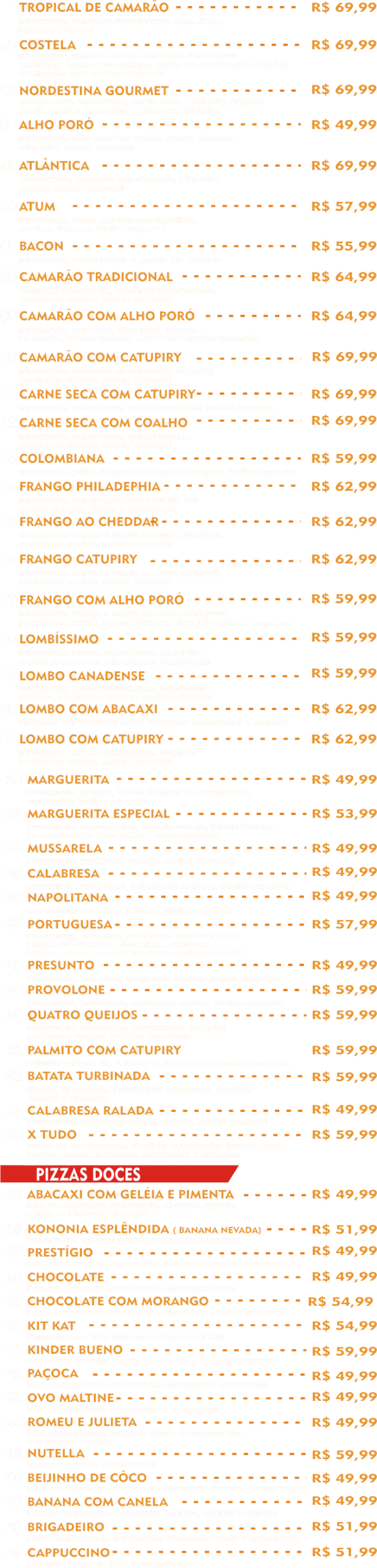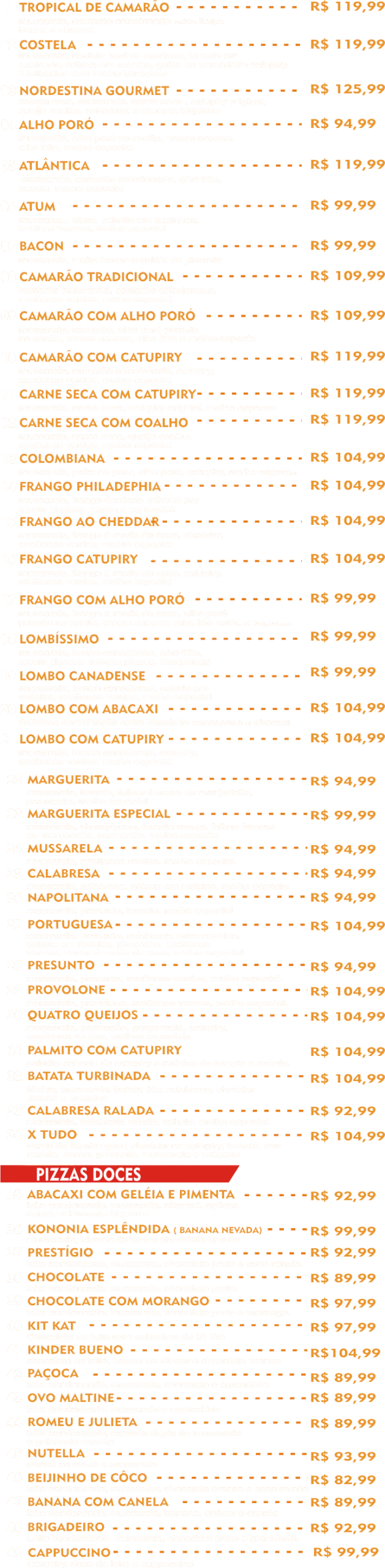mussarela, camarão selecionado extra limpo, bacon e abacaxi