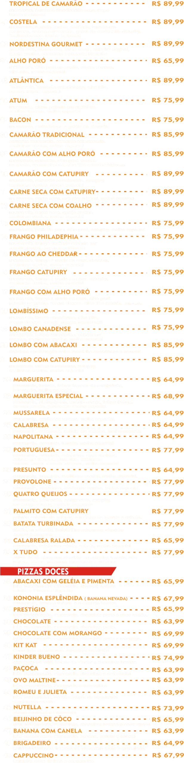 mussarela, camarão selecionado, alho frito, cebola, molho especial