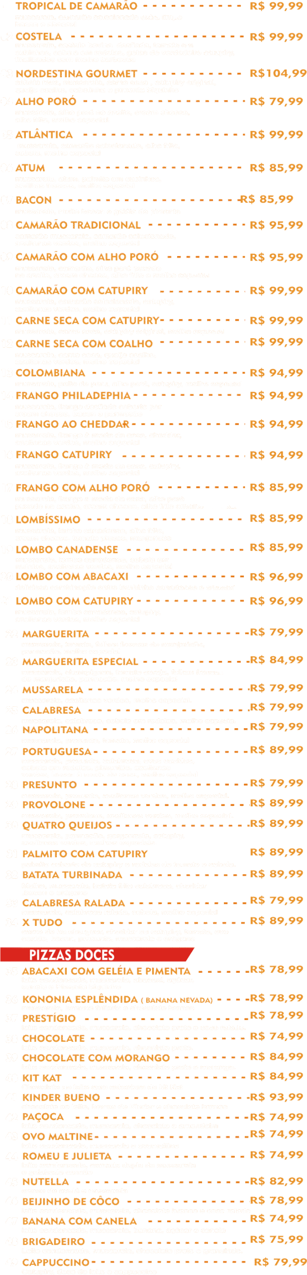 mussarela, parmesão, gorgonzola, catupiry, azeitonas verdes, molhos especiais